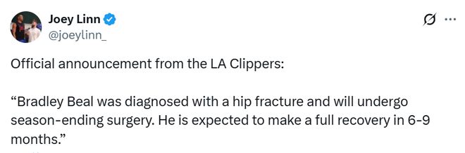 賽季報銷的手術(shù)意味著比爾更有可能執(zhí)行與快船隊合同中2026-27賽季的球員選項,該選項價值562萬美元。
